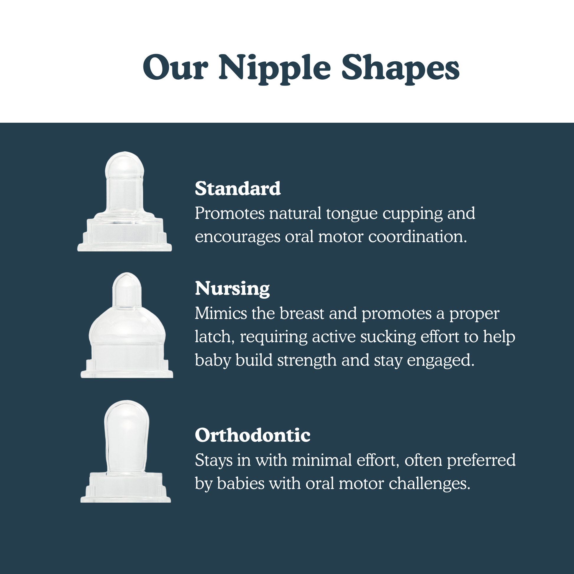 Instead of buying five different pacifiers, we give you three nipple shapes in one sustainable, baby-safe system—so your baby can lead the way.