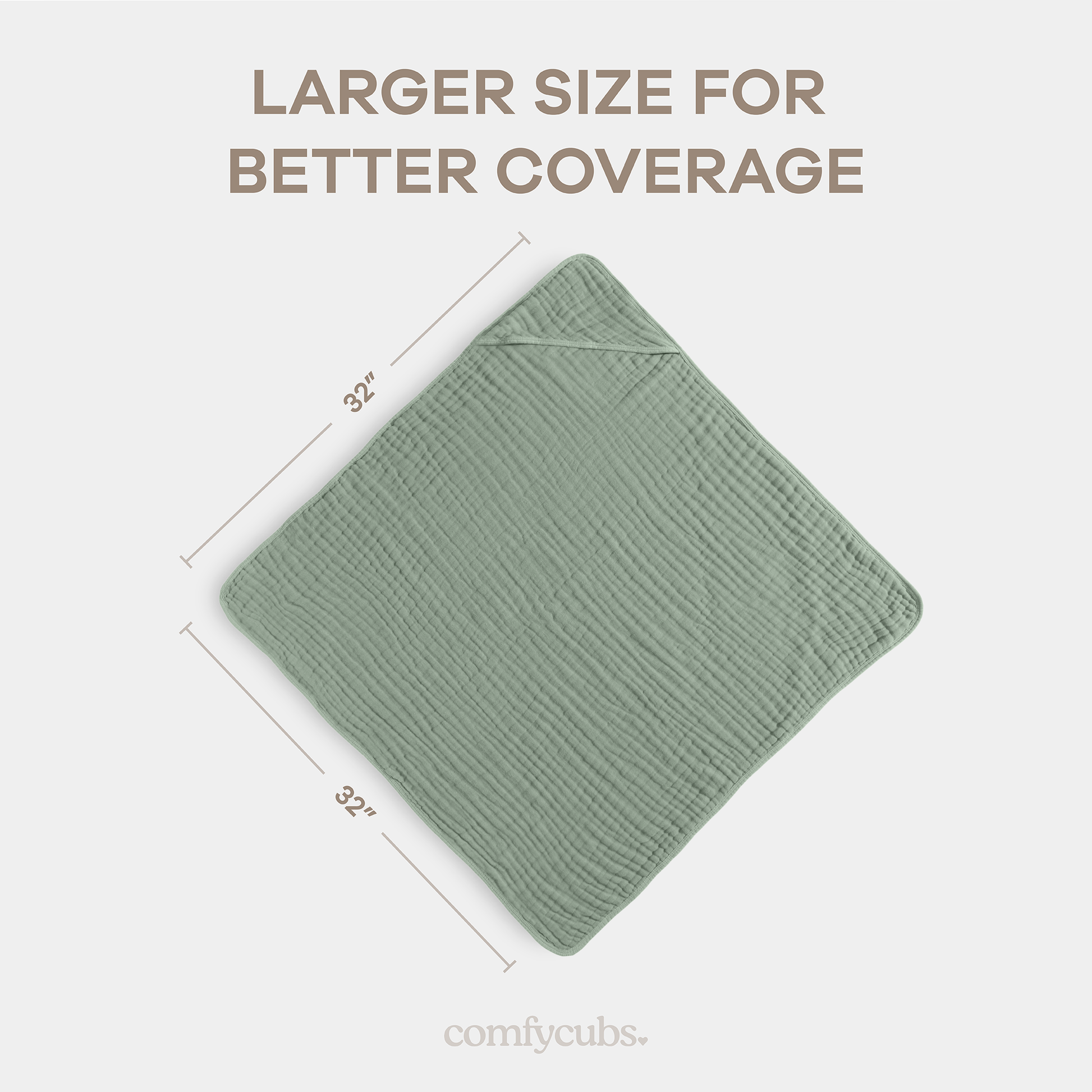 • Soft & Gentle: Made from 100% premium muslin cotton, Comfy Cubs hooded towels are designed with your baby’s delicate skin in mind. The ultra-soft fabric feels wonderfully comforting, ensuring your little one stays warm and snug after bath time.