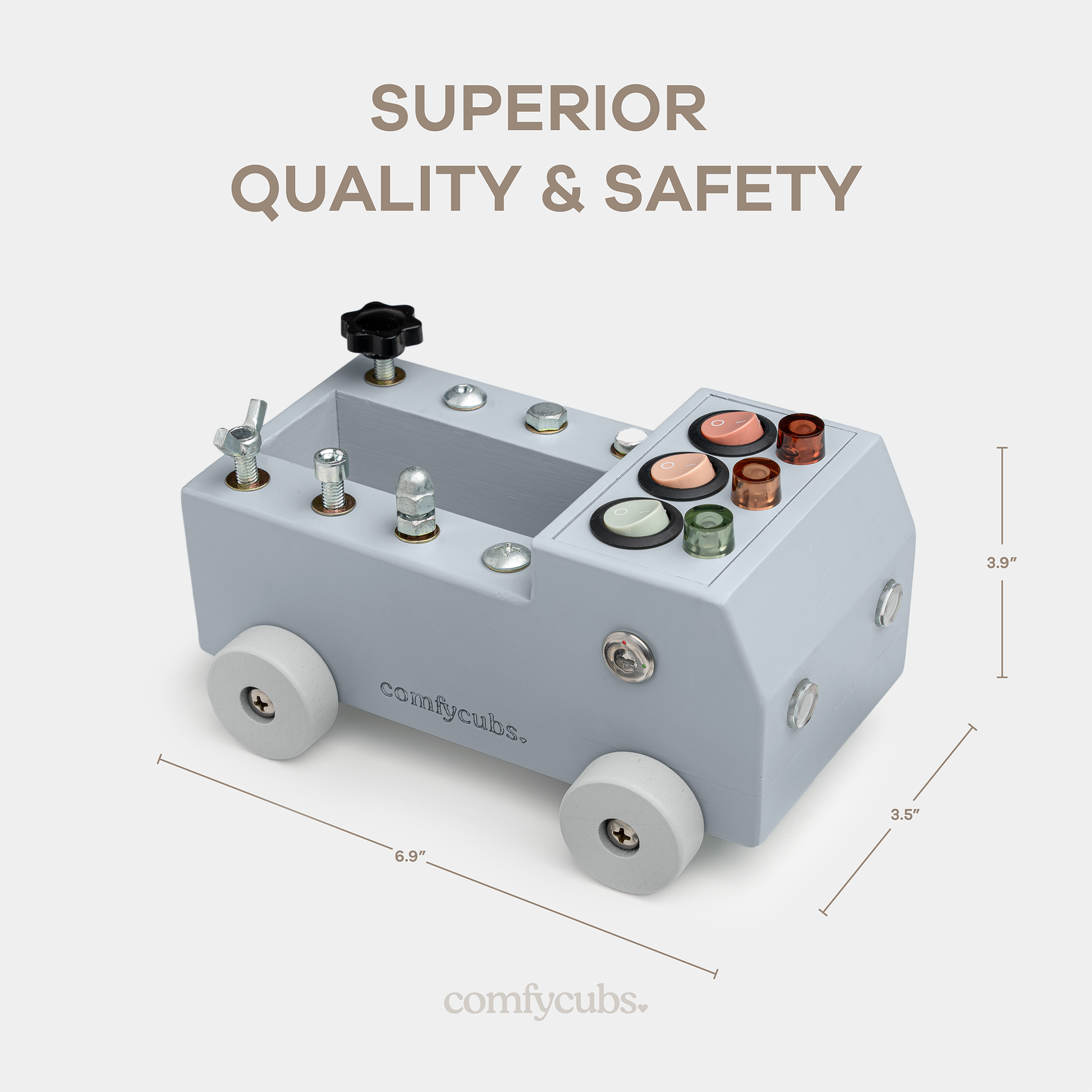 The Comfy Cubs Busy Board Toy Truck combines the fun of a toy truck with the hands-on learning of a Montessori activity board. Our truck toys are made from sturdy pine wood and finished with non-toxic, water-based paint. This toy is built to stand up to everyday play while being safe for your child.