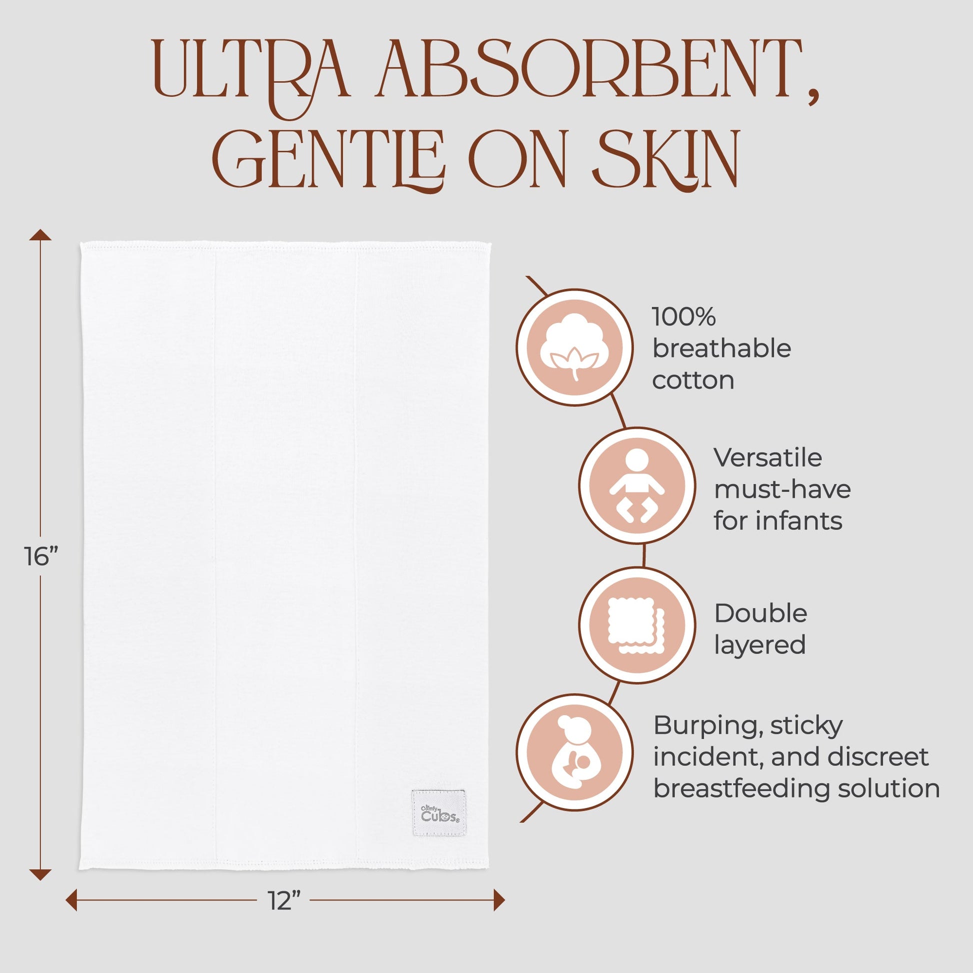 PACK INFORMATION – each pack contains 6 x or 10x burp cloths, measuring 16" x 12" inches each. The cloths are 100% Cotton and have 2 layers of extra absorbent, soft material
