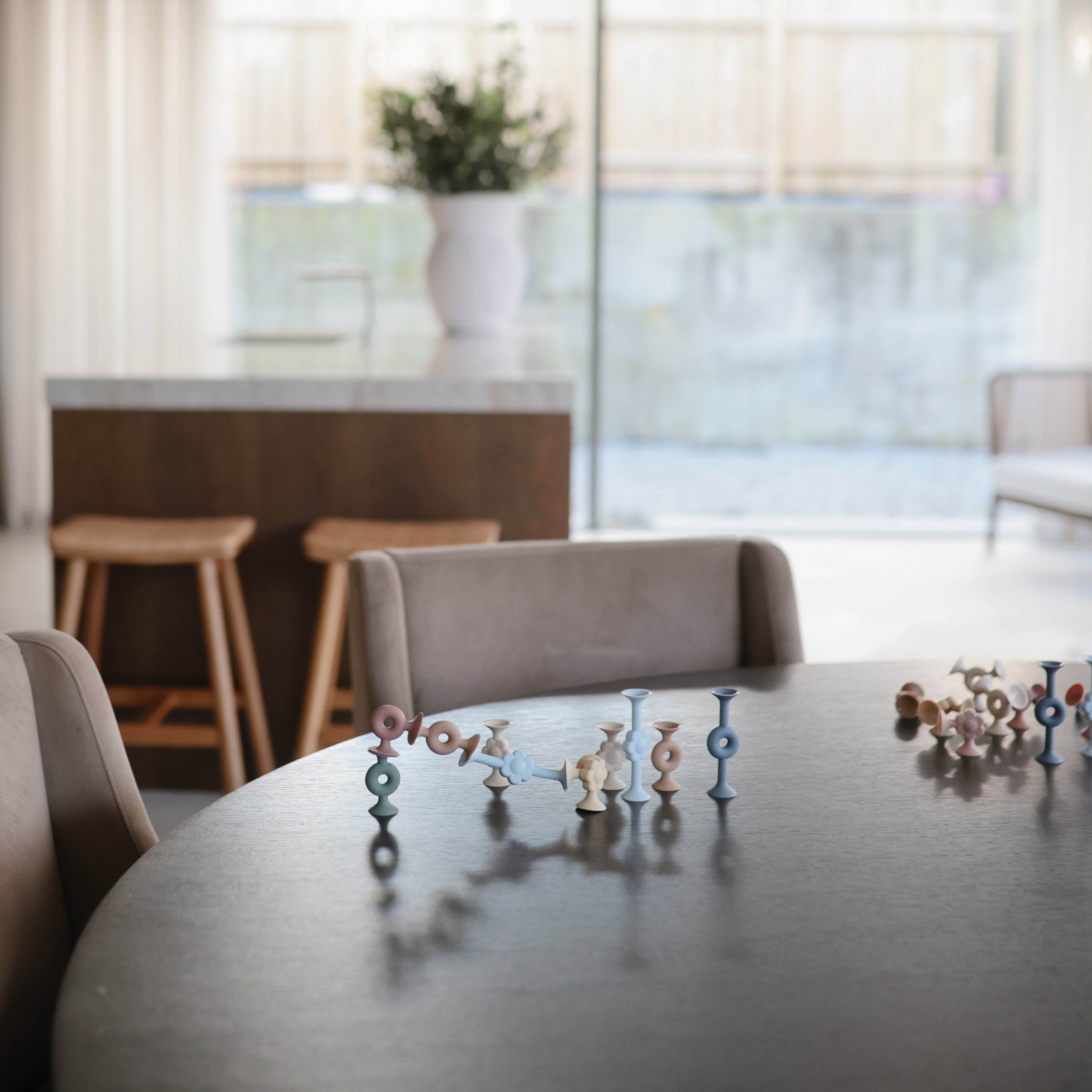 Unleash creativity and fun with this set of 18 silicone suction builder toys. Made from flexible, non-toxic silicone, the pieces easily connect, stack, and stick to smooth surfaces for a versatile toy during play time or bath time. Ideal for fostering motor skills and spatial awareness with endless opportunities to explore and create. When playtime is over, they neatly store away in a reusable storage container that keeps everything organized and ready for the next creation.