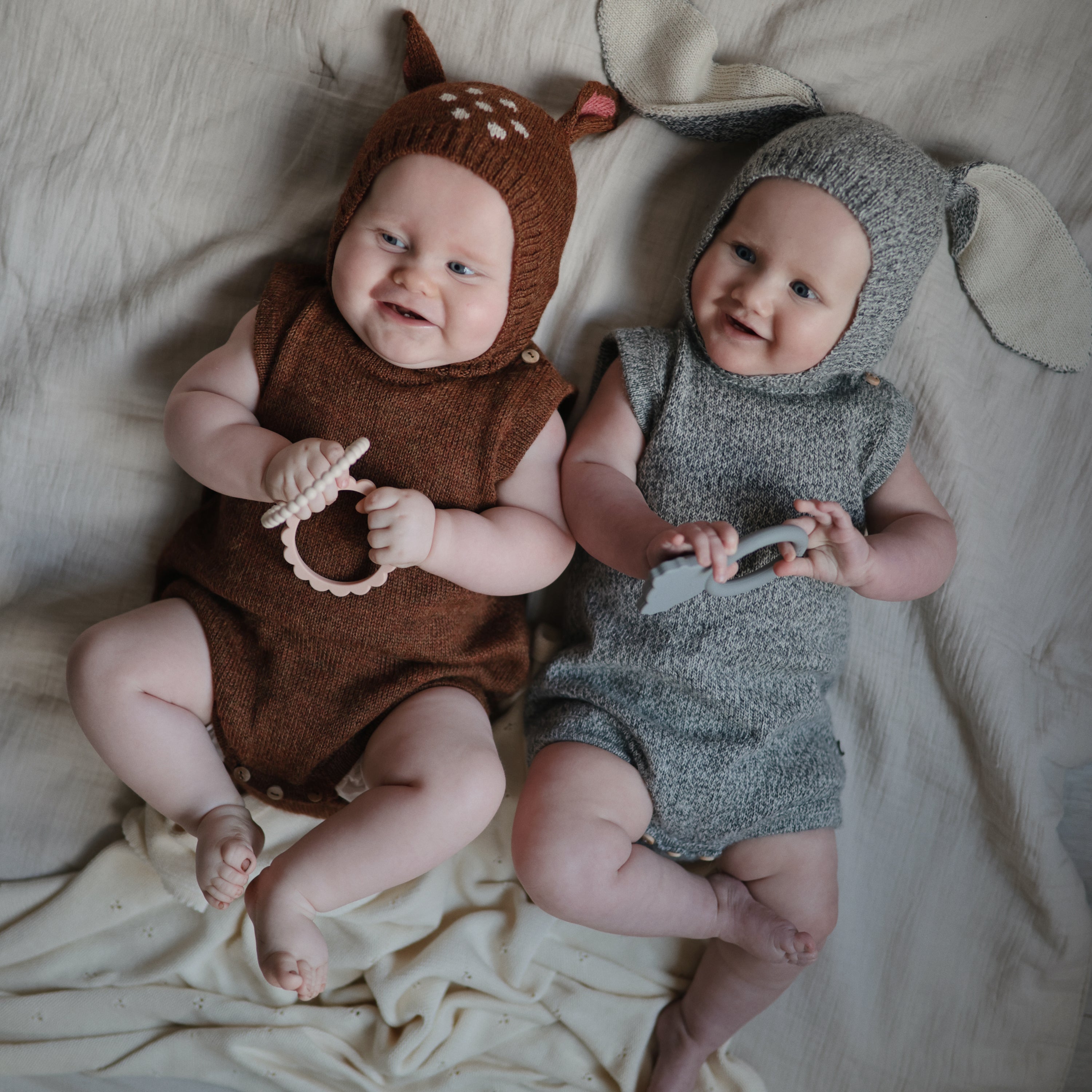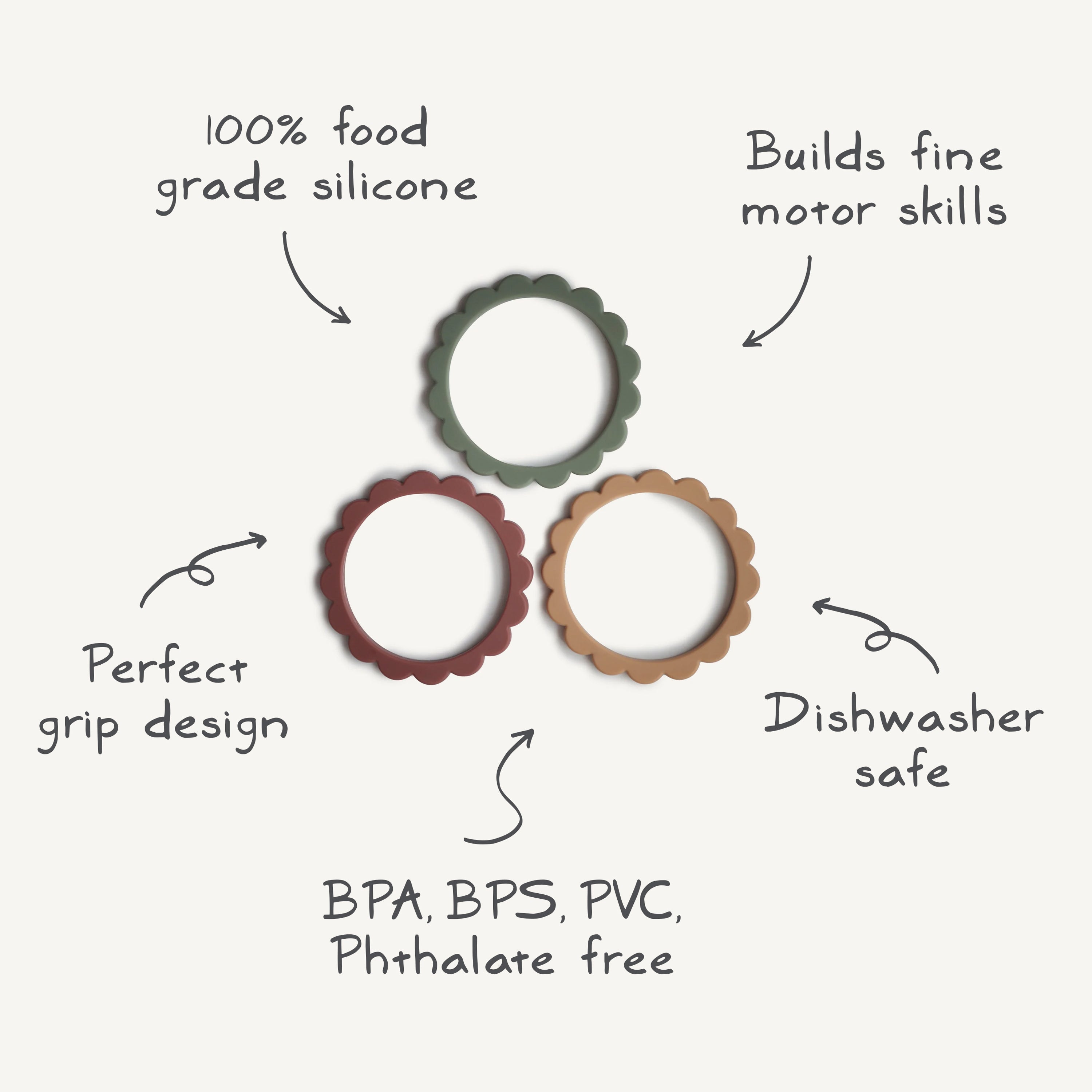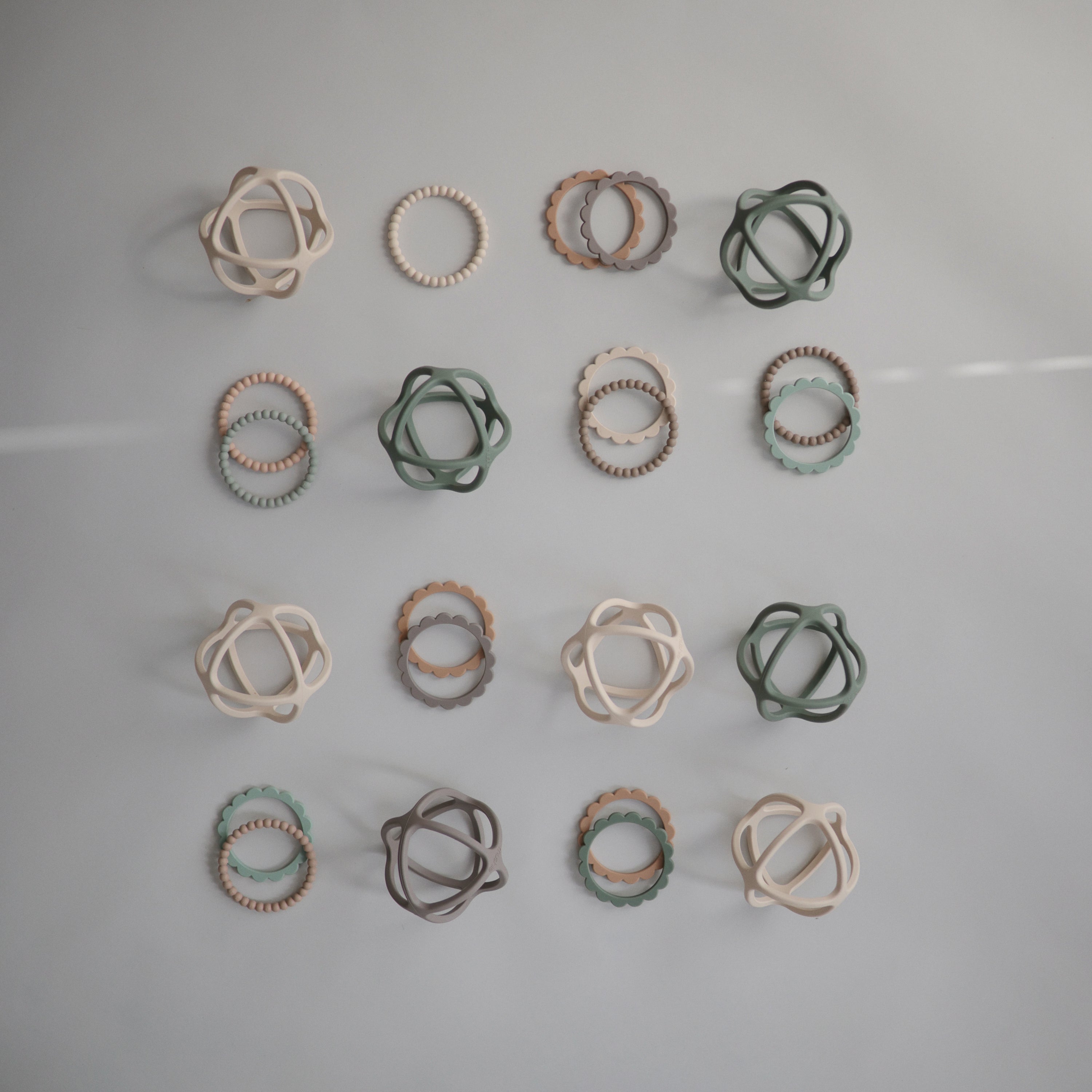 Help soothe your baby's irritated gums with our line of teethers. Made from 100% non-toxic, food-grade silicone, and designed to be easy to grasp by tiny fingers, our teethers are safe for your baby to use. Their sophisticated colors and playful design make them a stylish addition to your home.