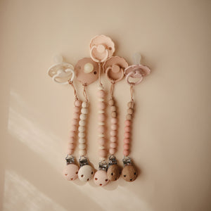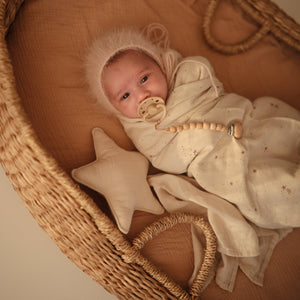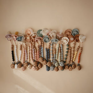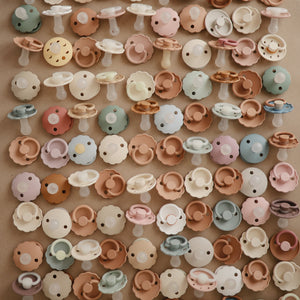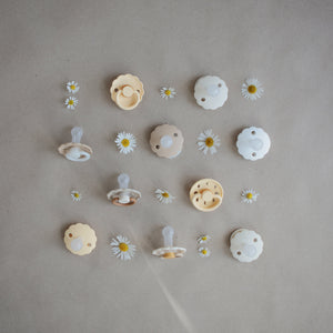 The FRIGG line of moon phase silicone pacifiers with improved SilkySoft™ nipple and an innovative Click-lock System has been thoughtfully designed for your baby's comfort and inspired by the moon in motion. The outward curve keeps the pacifier off their delicate skin, while features like air holes and a security handle ensure your baby stays safe. Within the pacifier shield, air holes reveal the eight phases of the moon in subtle detail. Available in a range of soft colors, FRIGG pacifiers make a beautiful addition to your collection of baby essentials.