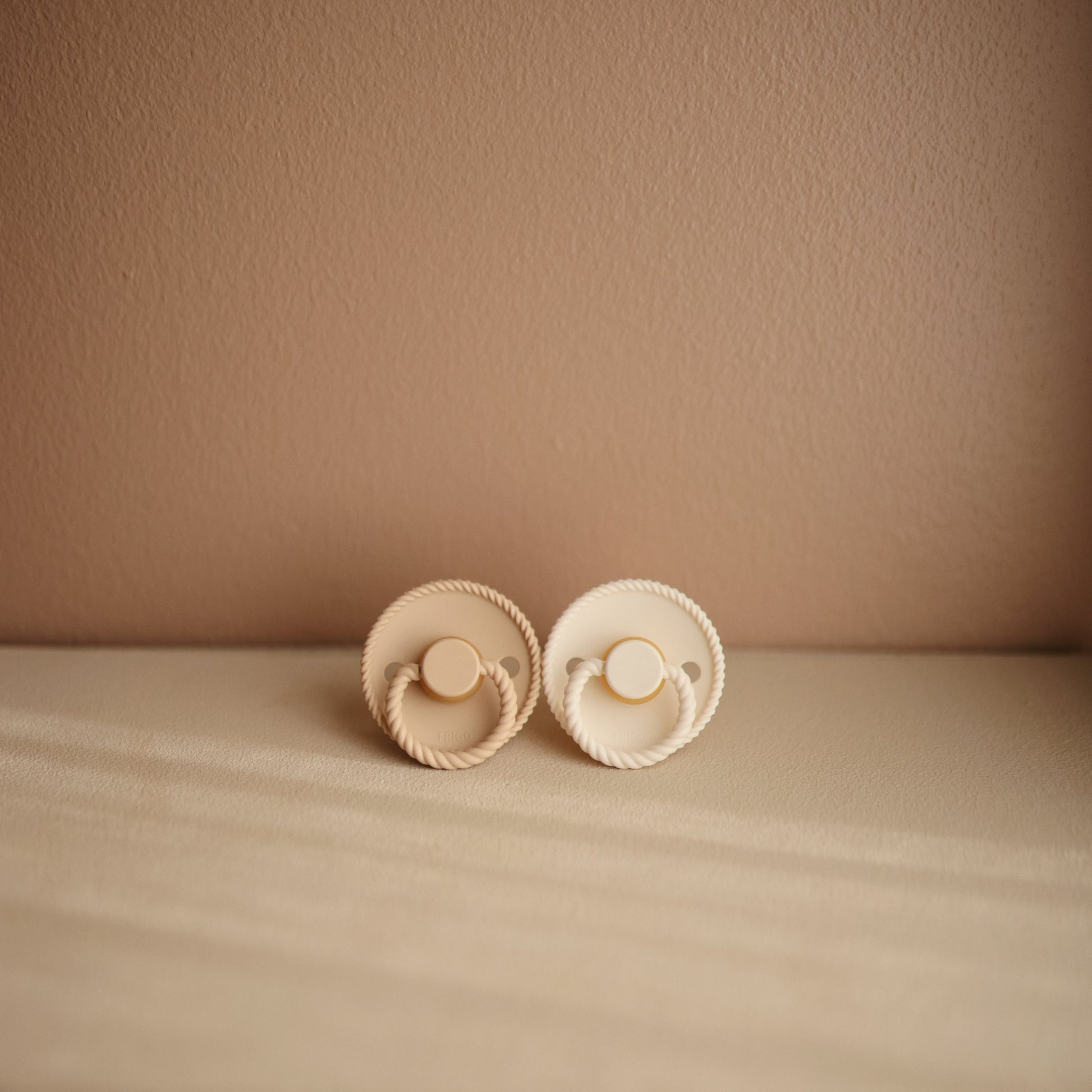 The FRIGG line of rope rubber pacifiers is thoughtfully designed for your baby's comfort and features an entwined rope that surrounds the pacifier shield. The outward curve keeps the pacifier off delicate skin, while air holes and a security handle ensure your baby stays safe. Available in a range of soft colors, FRIGG pacifiers make a beautiful addition to your collection of baby essentials.