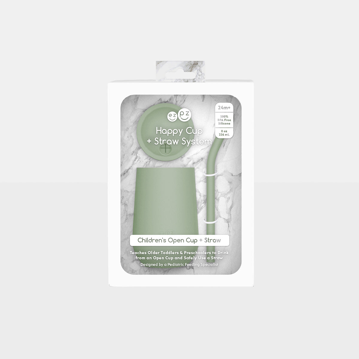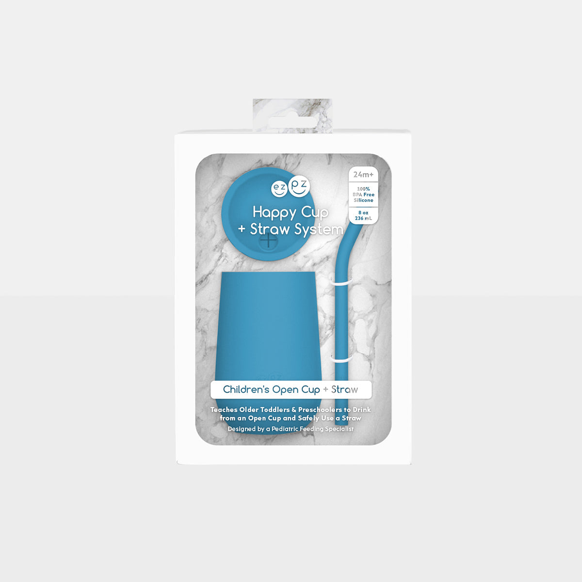 Learning to drink from a straw is an important developmental milestone that develops lip rounding and promotes speech development. The Happy Cup + Straw teaches older toddlers and preschoolers to safely drink from an open cup and straw independently.
