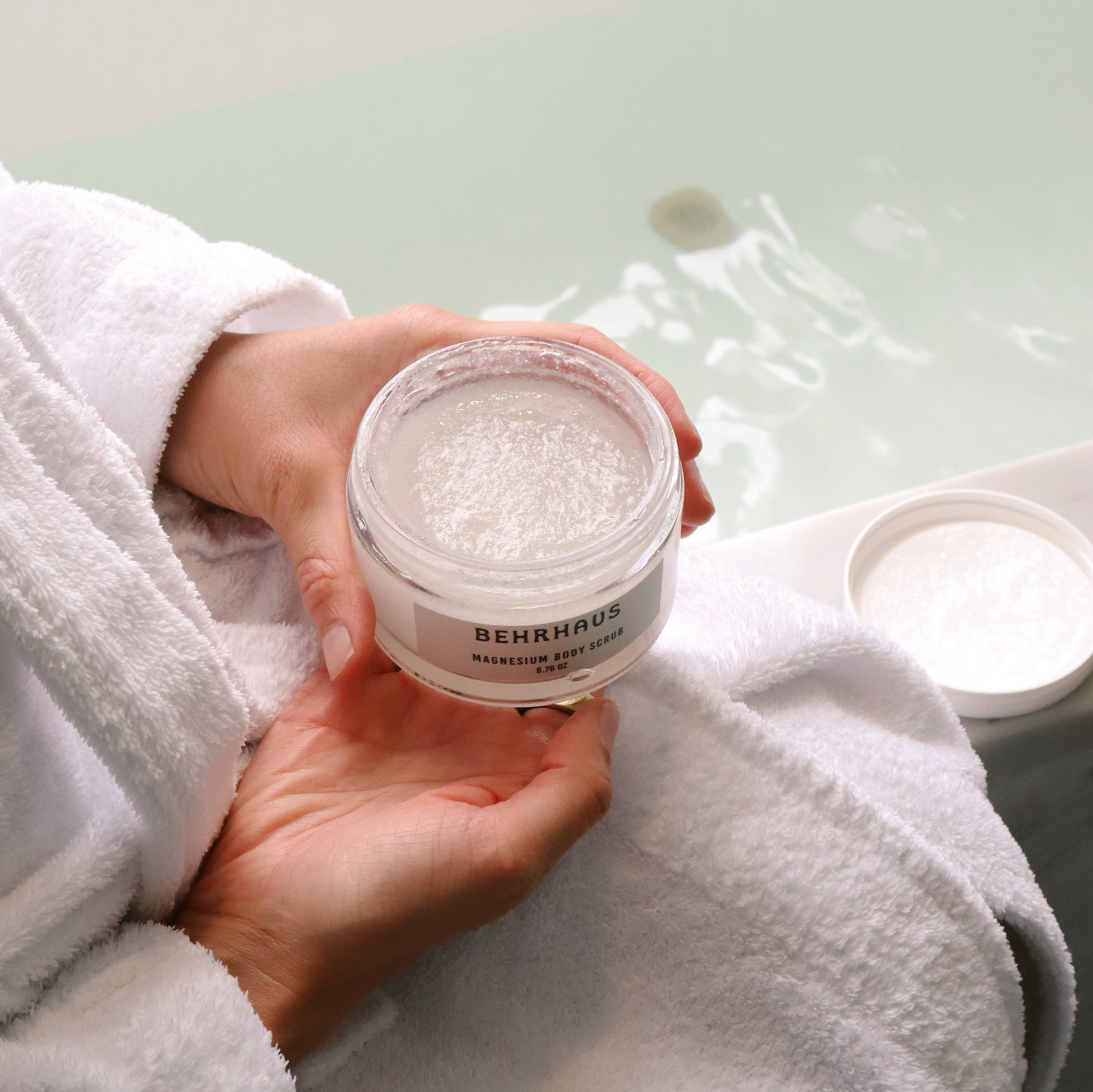 Exfoliate, nourish and glow! Our Magnesium body scrub is a silky blend of Elemental Magnesium and organic oils to soothe muscles, provide relief, cleanse and detoxify skin while putting your mind at ease. Experience the calming benefits of Magnesium -- entice your senses, improve circulation, increase moisture and reveal smooth skin.
