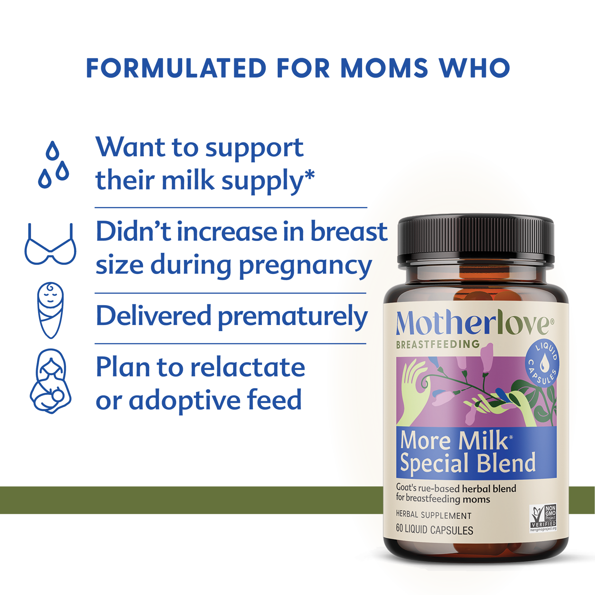 More Milk® Special Blend is a goat's rue-based herbal blend to support breast milk supply. This lactation supplement is a combination of five organic herbs that work as hard as you do—goat's rue, fenugreek, blessed thistle, nettle, and fennel.
