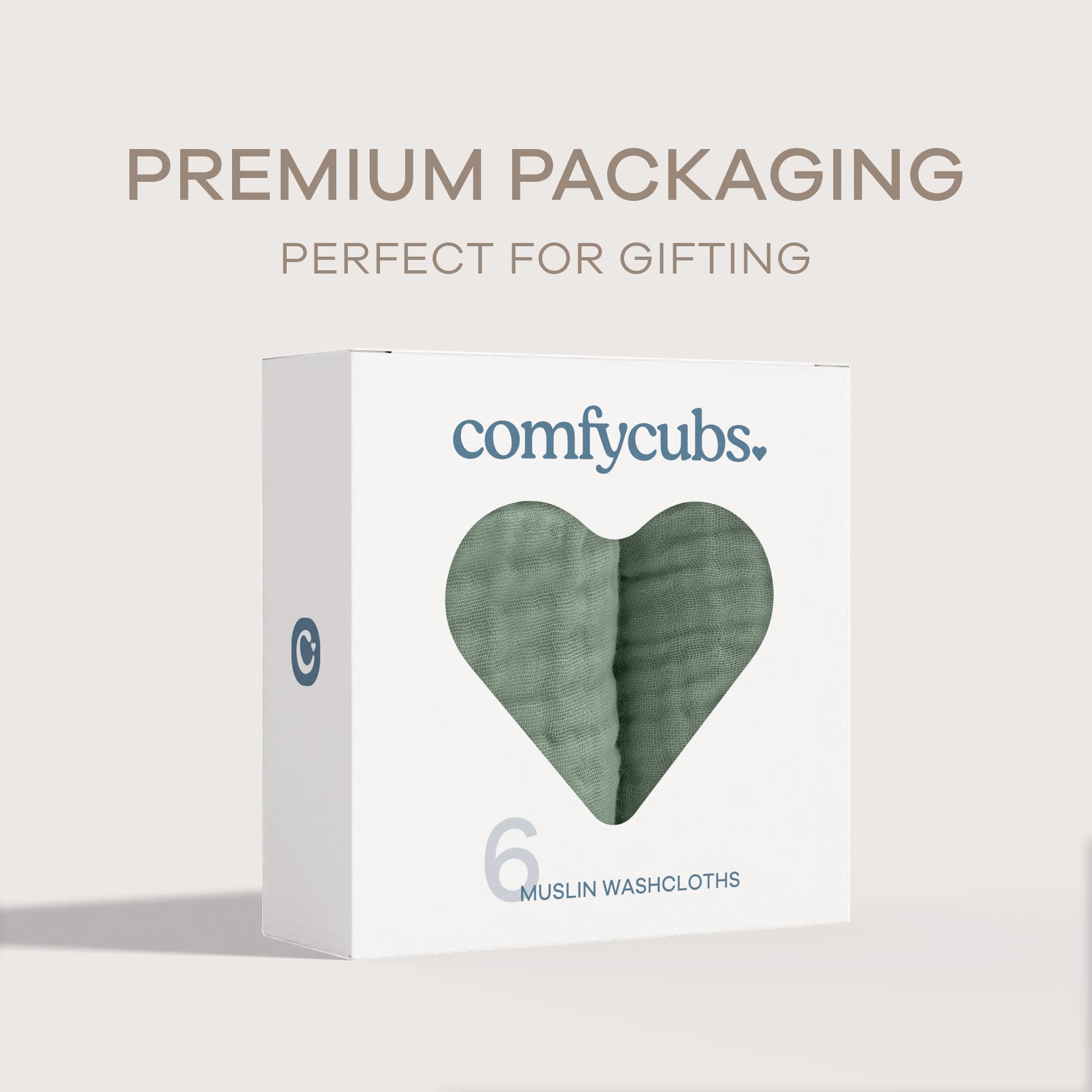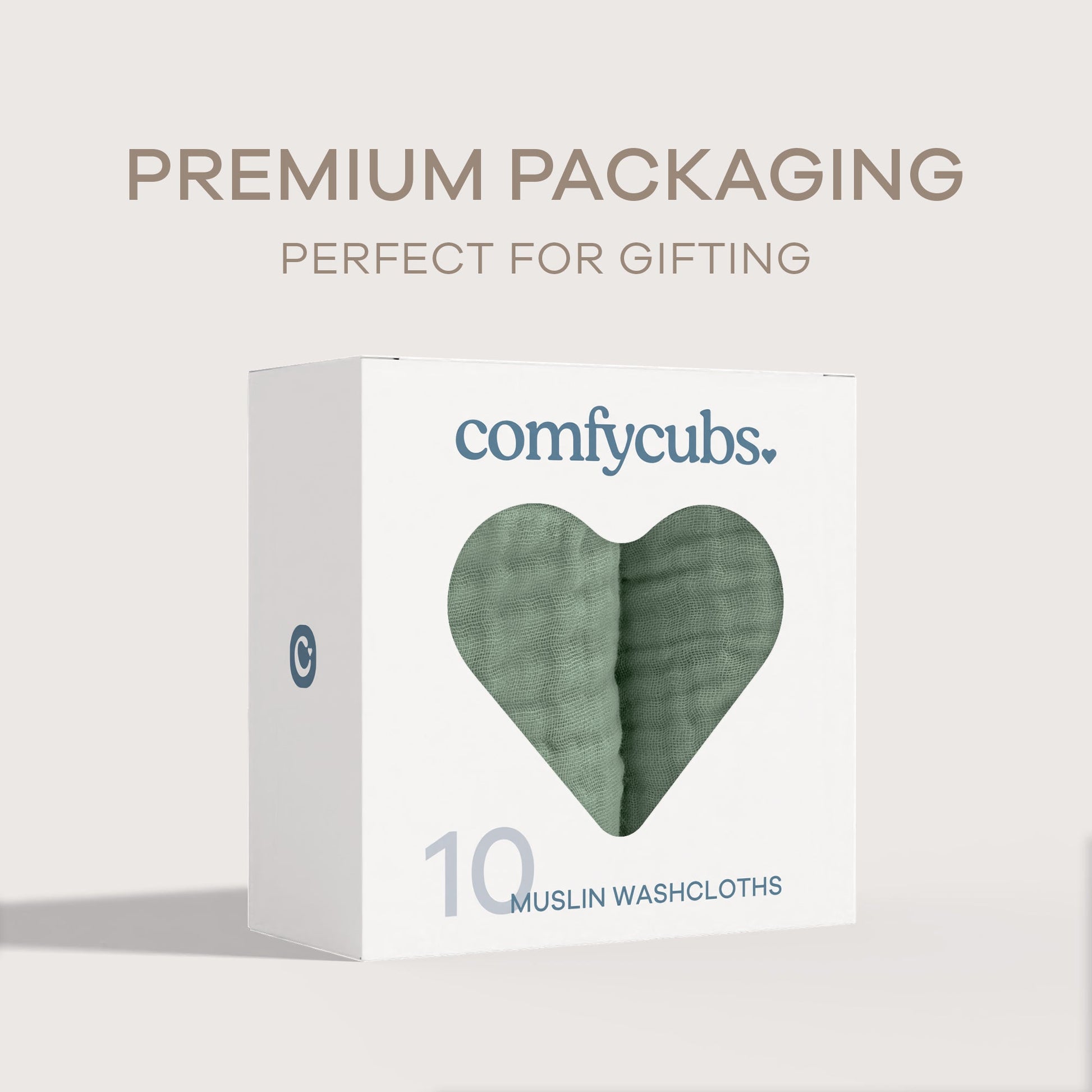 • Large Premium 10 X 10 inches Muslin Cotton Washcloths – Comfy Cubs Washcloths are made in a large 10 X 10 inches size and come in a convenient 6 pack or 10 pack.
