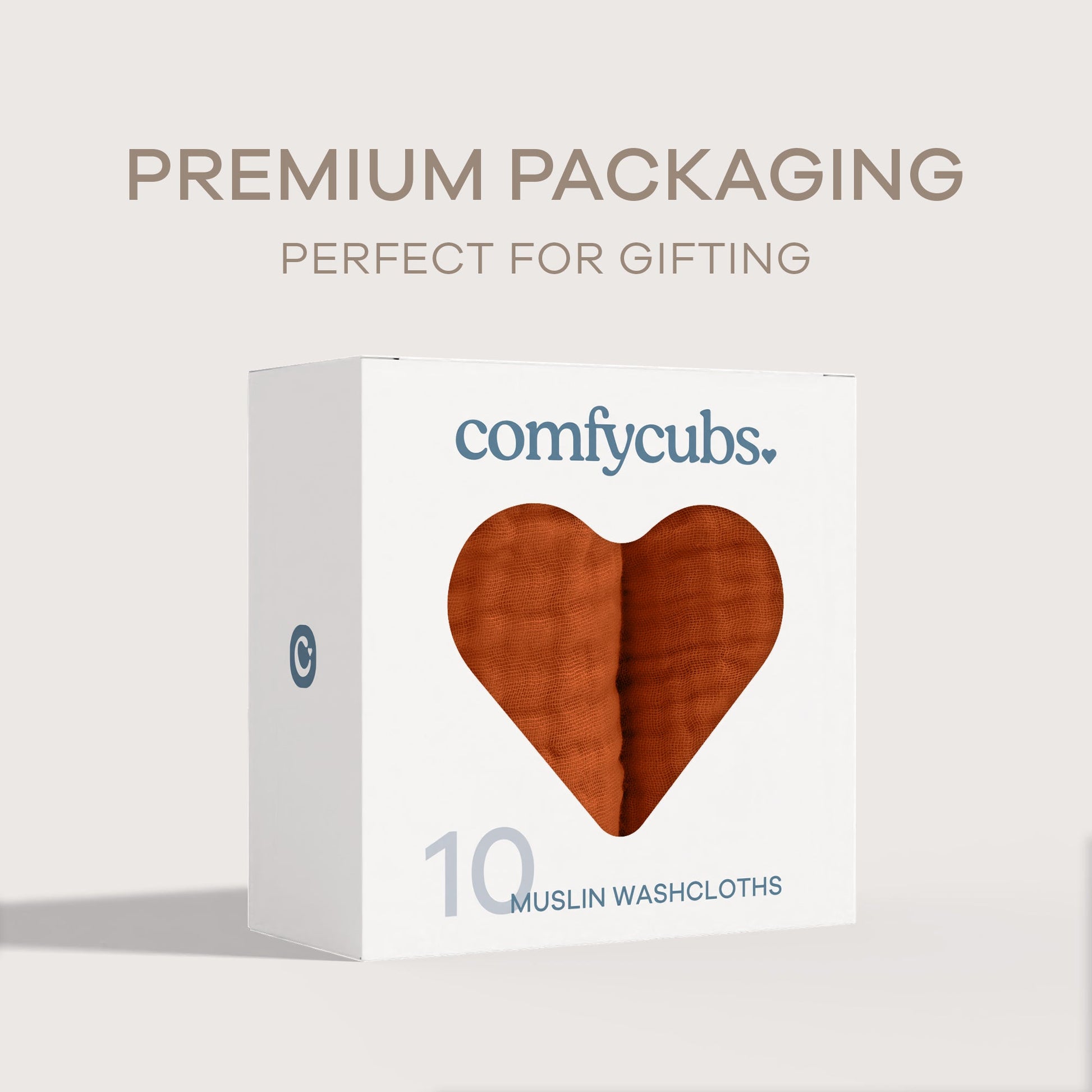 • Large Premium 10 X 10 inches Muslin Cotton Washcloths – Comfy Cubs Washcloths are made in a large 10 X 10 inches size and come in a convenient 6 pack or 10 pack.
