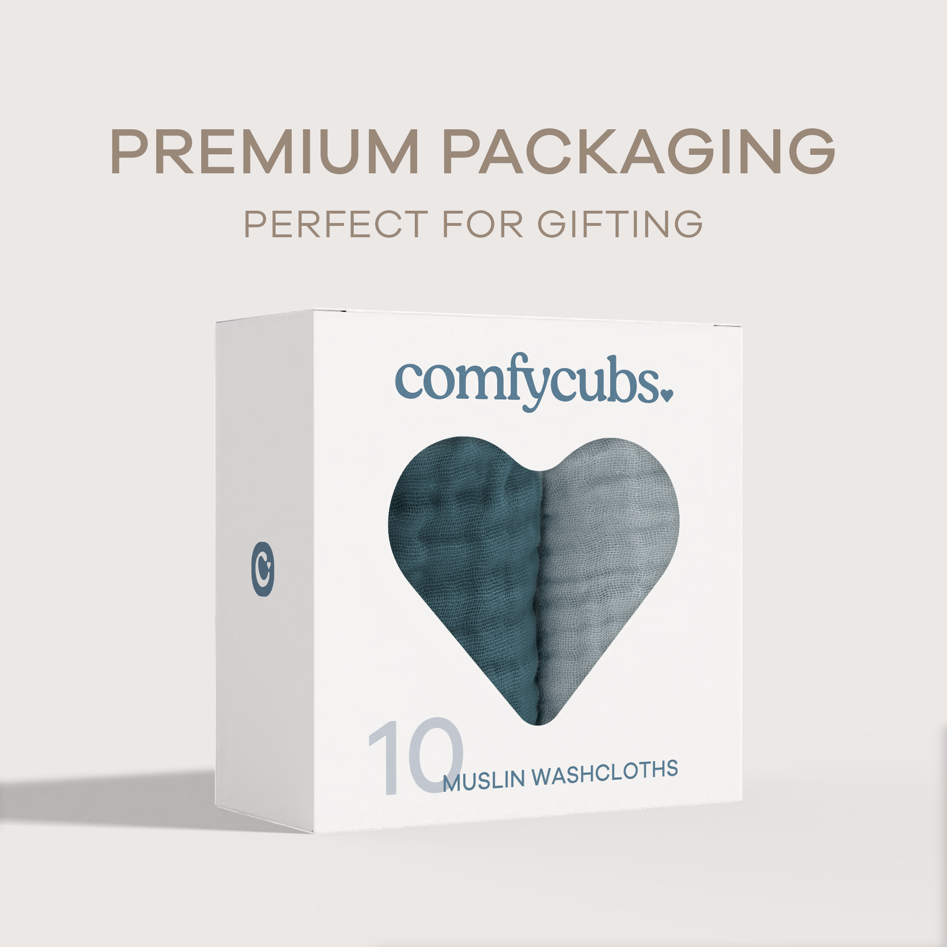 • Large Premium 10 X 10 inches Muslin Cotton Washcloths – Comfy Cubs Washcloths are made in a large 10 X 10 inches size and come in a convenient 6 pack or 10 pack.