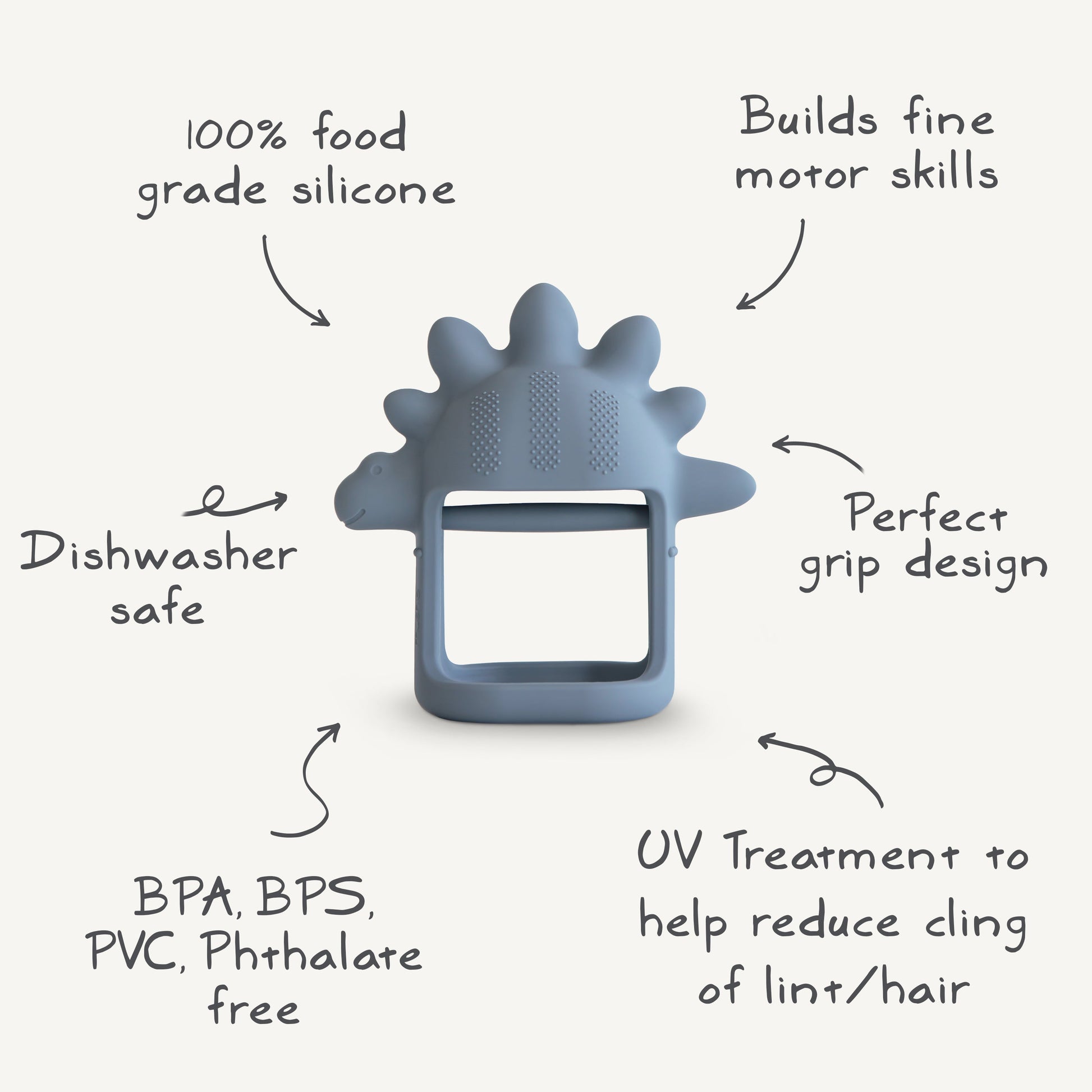 Help baby discover self-soothing techniques with our no-drop dino teether that supports the teething journey. With an interior handle that's easy to grasp without dropping, baby will enjoy holding tight and exploring the textured surface and soft edges. Made from 100% food grade silicone, this toy is safe for mouthing and chewing as littles seek relief for sore gums.