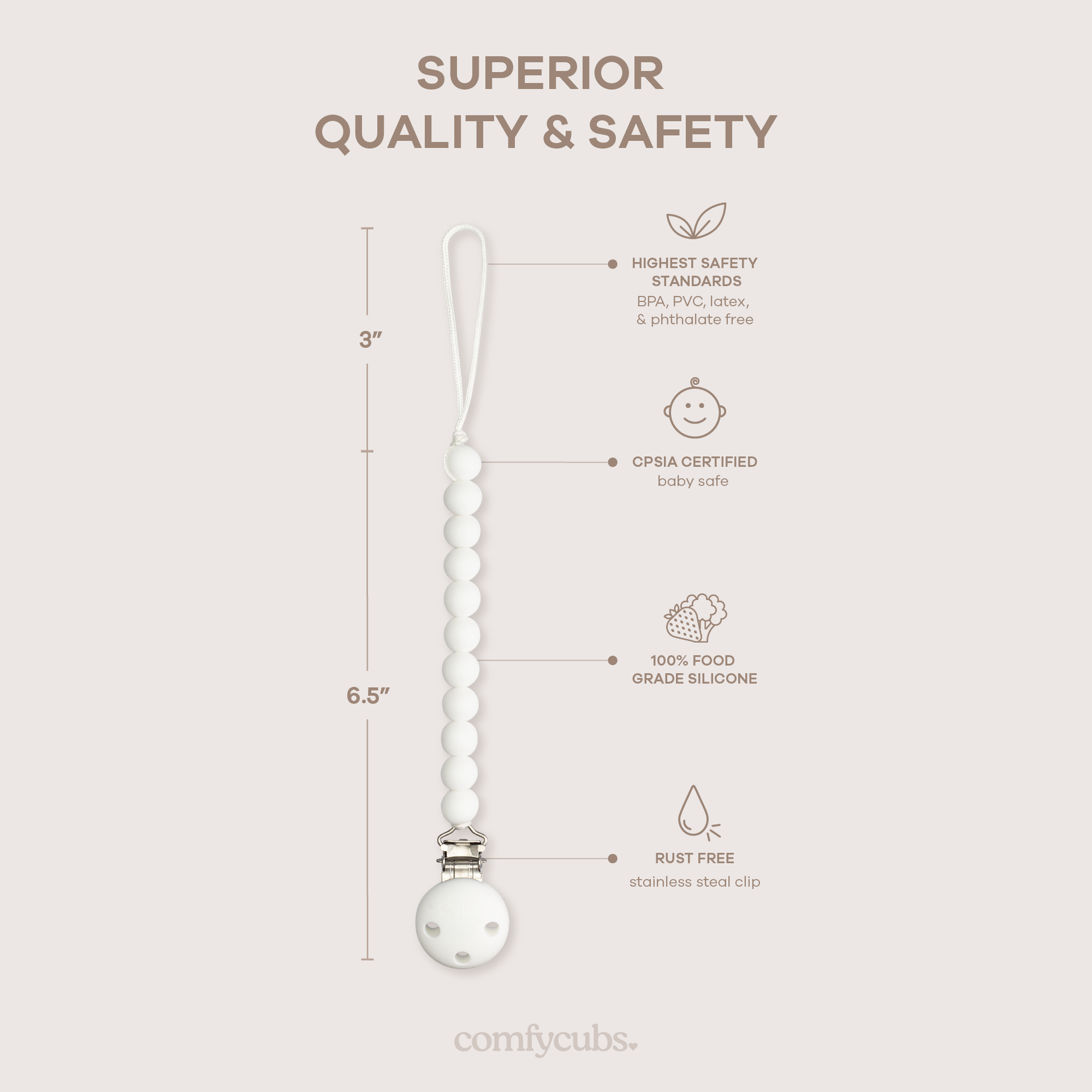 Choose Your Favorite – Our lovely silicone pacifier clip is available in 5 different beautiful colors, perfect for boys and girls! Choose from Earth Green, Sea Blue, Pink Blush, Grey, White, Beige, Beige and Light Beige & Beige, Light Beige and White, and add a chic, modern touch to your little one’s outfit!