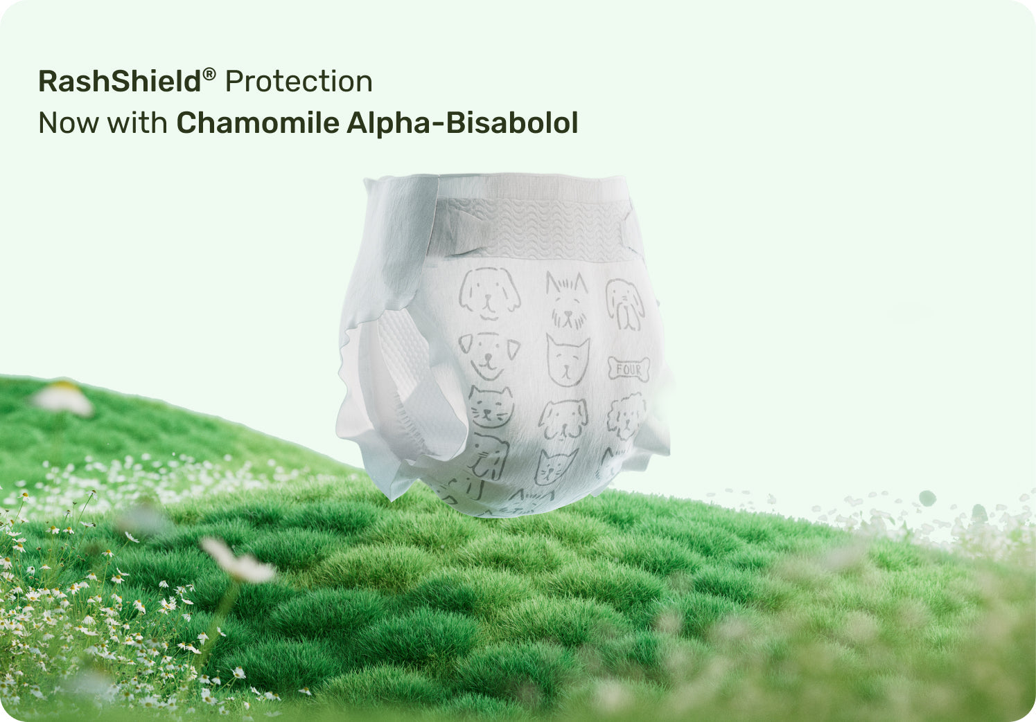 Every design detail of our diapers is built to deliver effective, all-day and overnight protection against diaper rash, while keeping the baby comfortable in softness and breathability. At the heart of this system is our chamomile Alpha-Bisabolol topsheet, enhanced with 99%+ antimicrobial effectiveness to help calm and protect sensitive skin.