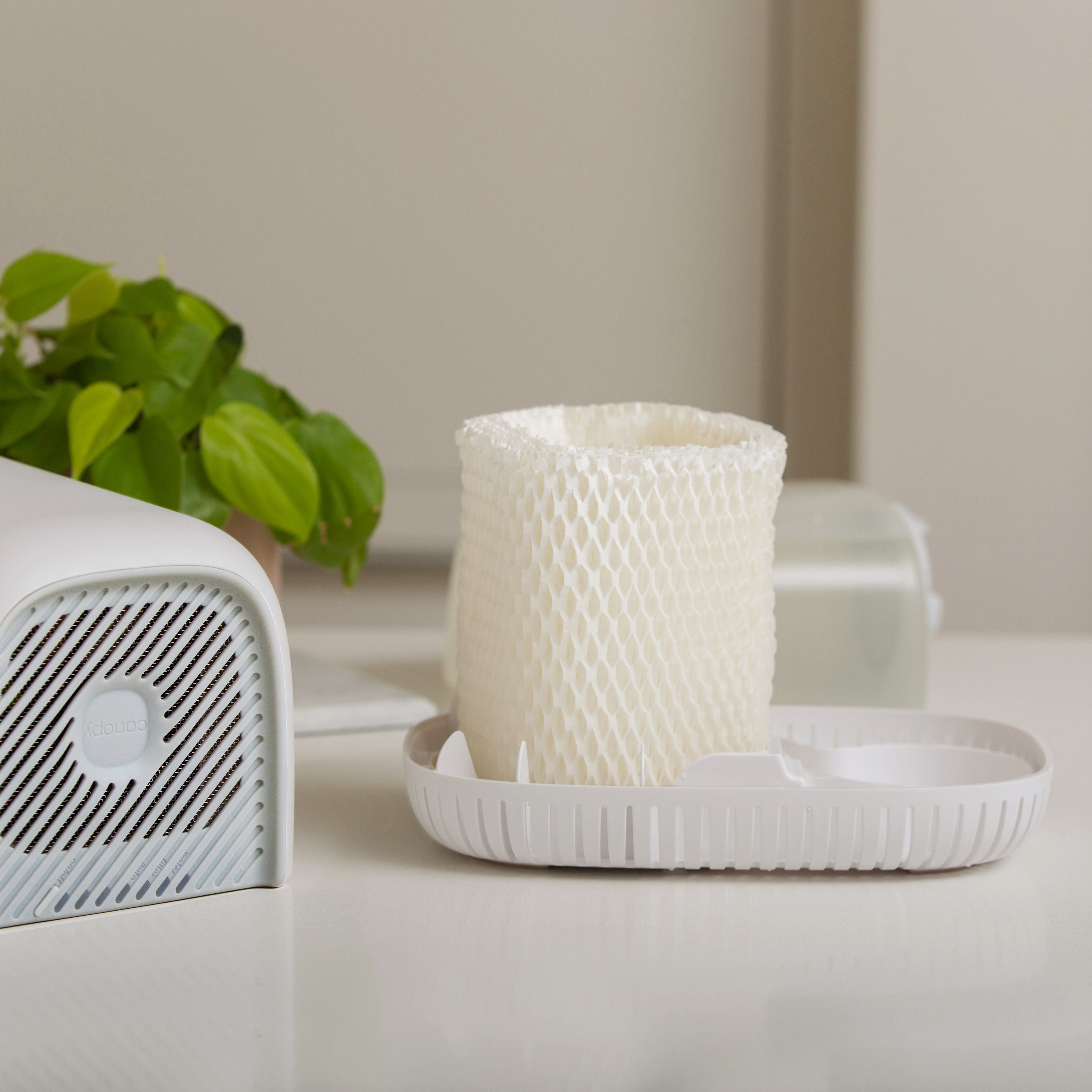 The Canopy anti-microbial replacement filter catches bacteria, metals, and other particles in the water before it is evaporated into the air. Made from wood pulp, the filter is 2x more efficient at wicking and evaporating water than synthetic filters. Slight discoloration will appear shortly after use begins - this means the filter is working. Canopy's filter light will illuminate when it's time for a replacement filter.
