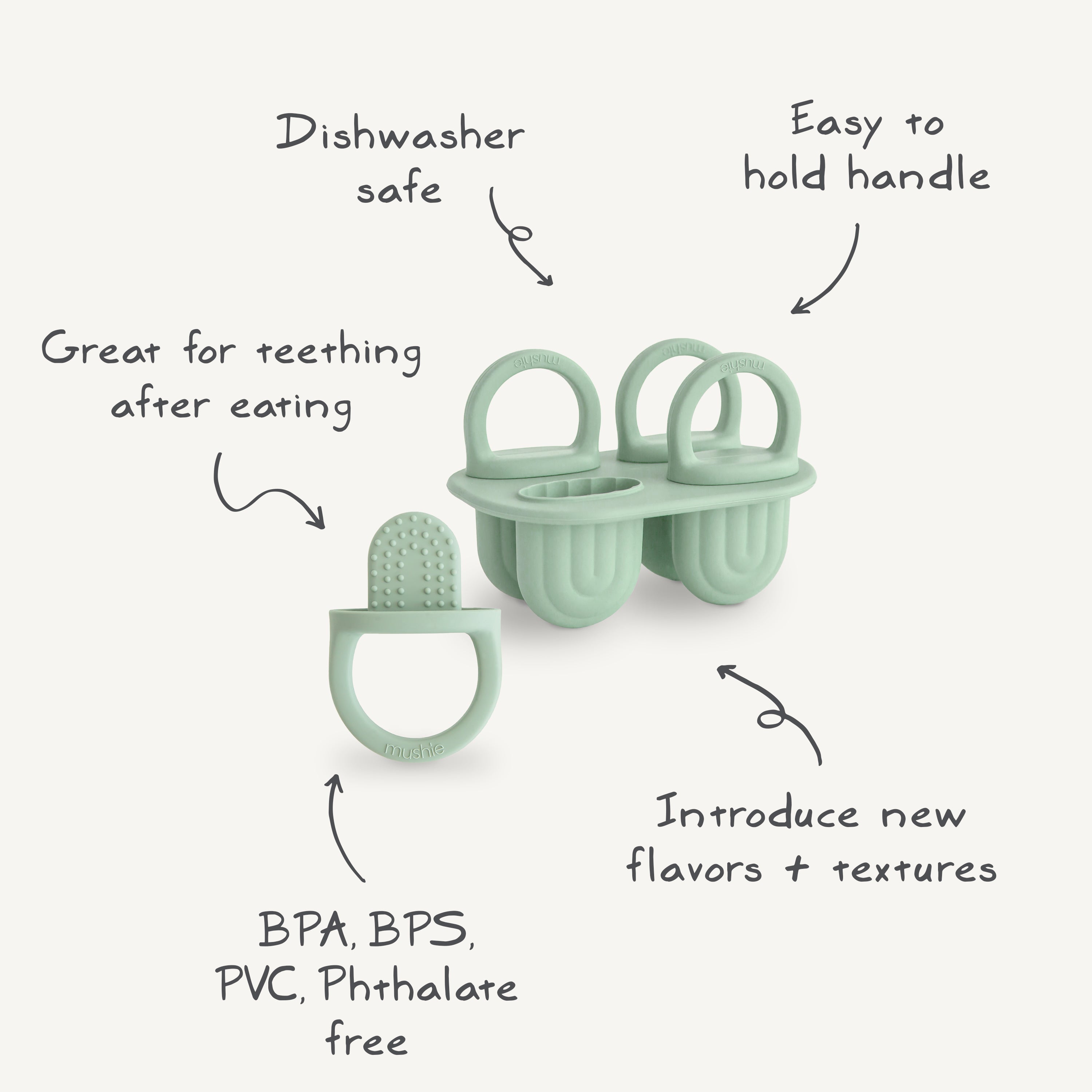 Brighten up snack time with the Mushie toddler ice pop tray. Featuring four compartments that create adorable rainbow-shaped popsicles. The food grade silicone tray is flexible, making it quick and easy to remove each pop. Littles can easily hold onto the small silicone handles and practice independent feeding. Perfect for creating healthy treats at home and introducing new flavors and textures. Dishwasher safe for hassle-free clean up.